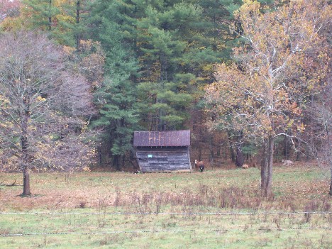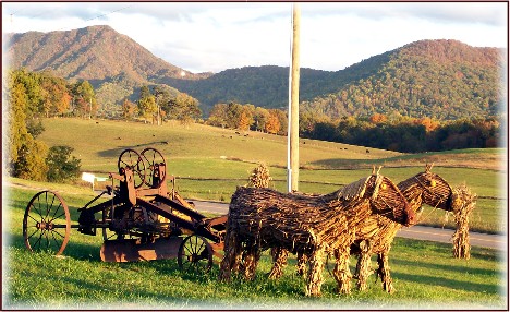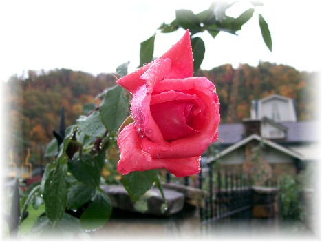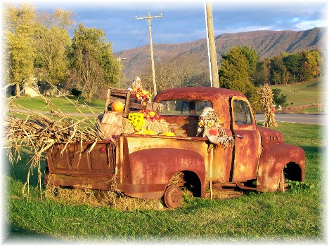 frightening since it is above the tree line in that region. I find this interesting: Mount Washington has a prominent height of 6,138 feet (prominent height, also known as autonomous height, relative height, shoulder drop (in North America), or prime factor (in Europe), is a concept used in the categorization of hills and mountains, also known as peaks. It is a measure of the independent stature of a summit.) By contrast Mount Mitchell has a prominent height of 6,089 feet and Pikes Peak in Colorado has a prominent height of 5,510 feet. However Mount Everest has a prominent height of 29,029 feet! (One of a few dozen peaks whose elevation and prominence are equal.) On the Blue Ridge parkway we drove over the Linn Cove viaduct built around the side of a mountain. Note: Due to the clouds at the time we were here I was unable to snap a photo and this photo is taken off the internet! We thought this old shed was interesting. Perhaps even the pony knew it to be much safer standing to the right of the shed since the shed was leaning left. In eastern Tennessee we passed an antique store with some fall decorations, including this very rusty truck. Along with this interesting team and old plow! Smoky Mountain rose taken in Gatlinburg, TN Today's