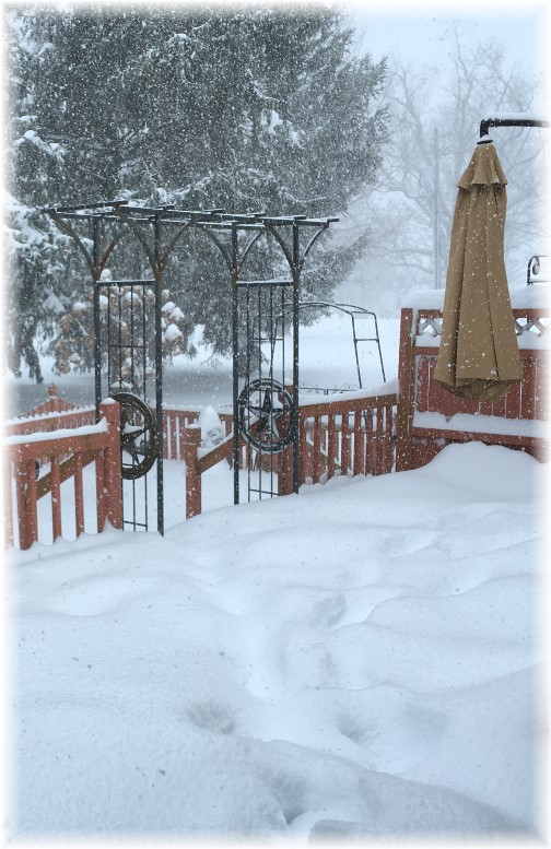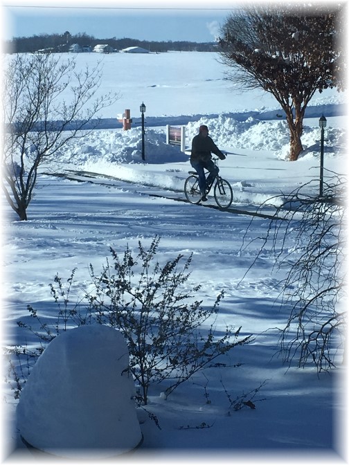 Or the process is long and you're losing your song in the night. You can be sure that the Lord has His hand on you, Safe and secure, He will never abandon you. You are His treasure and He finds His pleasure in you. He who began a good work in you. He who began a good work in you Will be faithful to complete it. He'll be faithful to complete it. He who started the work will be faithful to complete it in you. Be encouraged today, Stephen & Brooksyne Weber ![]() Some Scenes from Our Place ![]() Here's the front view we had on Saturday afternoon during the storm. ![]() Our side deck after Mollie diligently made a path to the deck steps. ![]() The heavy snow storm did not keep Mollie from wanting to play on Saturday! It only made her more eager since "Find the Frisbee" through inches of snow was the perfect game for her. She still tried to catch the frisbee in the air if she could get there in time. ![]() Here's the lower door I kept cleared out along with the path to my barn. ![]() What a blessing to see the big snow blower come roaring in on Saturday evening! ![]() Sunday morning it was bright and clear and I began digging out. ![]() On Sunday afternoon Mollie played with her rings in our back yard. ![]() After digging out I even took a short bike ride but didn't stay on the road long since it was very cold and I didn't outfit my bike with snow tires! (Notice the planter in the forefront with the buildup of about 28" of snow.) Today's Suggested Music and Supplemental Resources "He Who Began A Good Work" Video Steve Green Just for fun: Ester is developin some film-making skillls, thanks to helps from Iphone software, as evidenced by this one minute trailer about an upcoming movie featuring her border collie Mollie. Video ![]() I had asked the young Amish girls staffing the stand at the Central market and thought it would make a good quiz so on Friday we asked our readers if anyone could tell us what this sign says. The answer is... "Come Eat" A colorful memory from our current pastor's wife was during the years they pastored in Pennsylvania's Big Valley region with lots of Pennsylvania Dutch. "When we pastored in Belleville, the Deacon would often tell the people to Kom-Essa when we had carry in meals." Thanks for the many correct responses. To receive the "Daily Encouragement" each Monday-Friday through email see this page to subscribe to our email list. You can also subscribe to the Wordpress rss feed or through a Wordpress email subscription. (See the email subscription on the right side after opening this page.) We want to thank all who financially support our ministry. We realize there are many fine ministries and causes requesting support but if the Lord would lead you we surely need and appreciate the financial support from our readers and listeners. Our ministry labor is comprised of half our time to Daily Encouragement and the other half to our chaplaincy ministry to companies for which we receive a fee (of course this percentage of time varies week by week). Each of these ministries essentially is the same as a part-time job (20+ hours weekly) for each of us. Our goal for many years is that each phase would provide half of our ministry expenses and income. If you would like to make a donation to our ministry see here for more information. Donations through my chaplaincy endorsing ministry are tax deductible and will be receipted directly by them. Thank you! ![]() Permissions: Please feel free to pass on, reproduce and distribute any material on Daily Encouragement Net, in part or in whole, in any format, provided that you do not alter the wording in any way or charge a fee beyond the cost of reproduction. It is our desire to spread this material, not protect or restrict it. I do request that you keep the contact, copyright and subscription information intact. Scripture references are from The Holy Bible: New International Version. © 1984 by International Bible Society; NEW AMERICAN STANDARD BIBLE®, Copyright © 1995 by The Lockman Foundation, New King James Version (NKJV) Copyright © 1982 by Thomas Nelson, Inc. and the King James Version. Personal Mission Statement: "I am created by God to bring Him glory. Through God's Son Jesus Christ I have been redeemed and make it my life's goal to please the Lord. My mission in life is to honor God through my faith and obedience and prepare myself and all whom I may influence for eternity." © Copyright 2016 Stephen C. Weber - All Rights Reserved Daily Encouragement Net - 495 Kraybill Church Road - Mount Joy, PA 17552 USA |