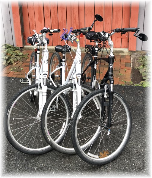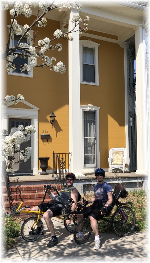 citizens. Amen.![]() Friends, Jason and Angie Kinney, joined us for our ride with this photo taken in front of a a stately home in Marietta, PA. The Kinneys get lots of looks from fellow bikers and walkers as they ride their recumbent bikes. I tried riding it but... I don't think it's for me - nor did Brooksyne. ![]() During our bike ride a big Norfolk Southern freight train roared by as it headed up the river toward Harrisburg and beyond. ![]() On a beautiful Saturday afternoon we cleaned and tuned up our bikes getting ready for what we hope will be another long riding season. Today's