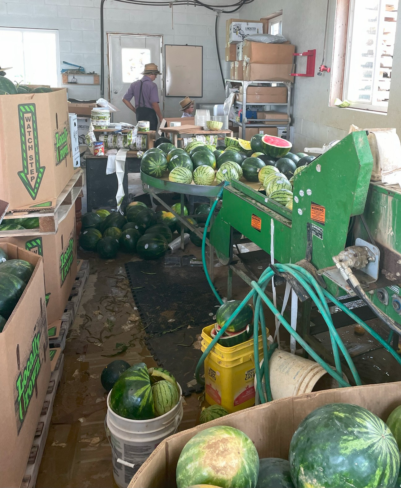 Yesterday I rode up the road and passed our neighbor Eli's farm. A Lancaster Farm Fresh co-op truck drove down his lane so I knew he must have harvested something fresh. I followed the truck down the dusty lane to check it out. The truck was there to pick up watermelons freshly picked from the field. Eli