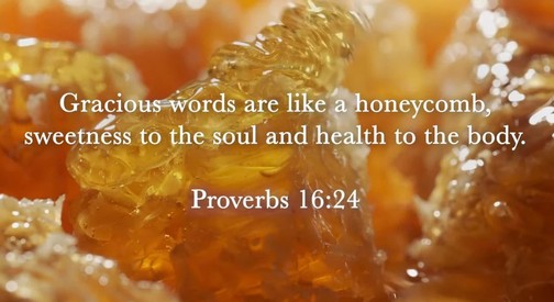flow". "But a kind word cheers him up". The word for "cheer" is literally derived from a Hebrew word meaning to "brighten up." Thank God for the blessing of gracious words! They really are, as our second verse states, "like a honeycomb, sweetness to the soul and health to the body". We have so