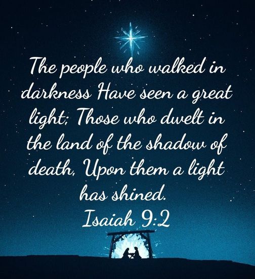 player. Early yesterday morning, long before sunrise, I was driving on a dark highway. I guess my eyesight is not as good as it once was as I had trouble seeing clearly and had to really concentrate (always a good idea when you are driving). Good thing I was since there was a pedestrian along the road wearing dark clothing walking with the traffic flow (that is, he was not facing me, the driver of the approaching car). It startled me as I considered the possible consequences that could result from a brief lapse in giving my full attention. Like the man I saw yesterday morning, many walk in darkness in a literal physical sense. But far more walk in spiritual darkness every day. After the fall it's the natural state of the human race. Light is one of the great themes of the incarnation. Light can be glowing, beaming, piercing, twinkling, dim or intense. There are many sources of light: in nature the sun, moon and stars in their courses above. In our homes we have light from electricity, and perhaps candles. Our Amish neighbors use gas lanterns or increasingly battery-operated lights (which they use in the schools). Some may have the warm light radiating from the flame of burning firewood and for many years we had a warm light from our coal stove when we burned it in the cold months of the year. But there is only one source of life-giving spiritual light! Our verse